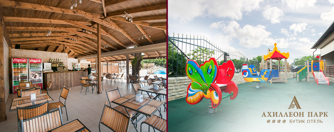 Для полноценных летних каникул наших гостей, на территории Ахиллеон Парк мы предусмотрели просторную зону отдыха, включающую кафе с широким выбором напитков и полноценным обеденным меню, тренажерный зал на открытом воздухе, игровую площадку для детей, шезлонги для принятия солнечных ванн и, конечно же, главный атрибут незабываемого летнего отдыха – бассейны.