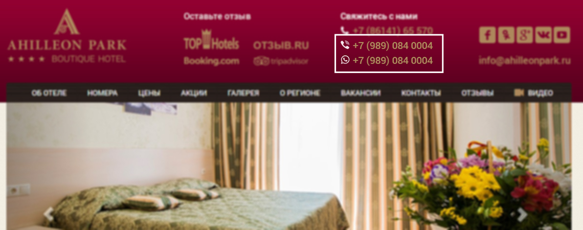 Из года в год мы не только повышаем уровень и число предоставляемых услуг, но также совершенствуем множество дополнительных опций, призванных вывести ваш отдых на абсолютно новый уровень. Одной из подобных новинок этого года станет упрощенный способ бронирования отдыха в нашем отеле с помощью таких известных мессенджеров, как Viber и WhatsApp. Все что для этого нужно, просто добавить наш номер телефона +7 (989) 084 0004 в ваш список контактов в Viber и WhatsApp либо нажать на указанный номер рядом с соотвествующей иконкой приложения Viber или WhatsApp в самом верху любой страницы нашего сайта.